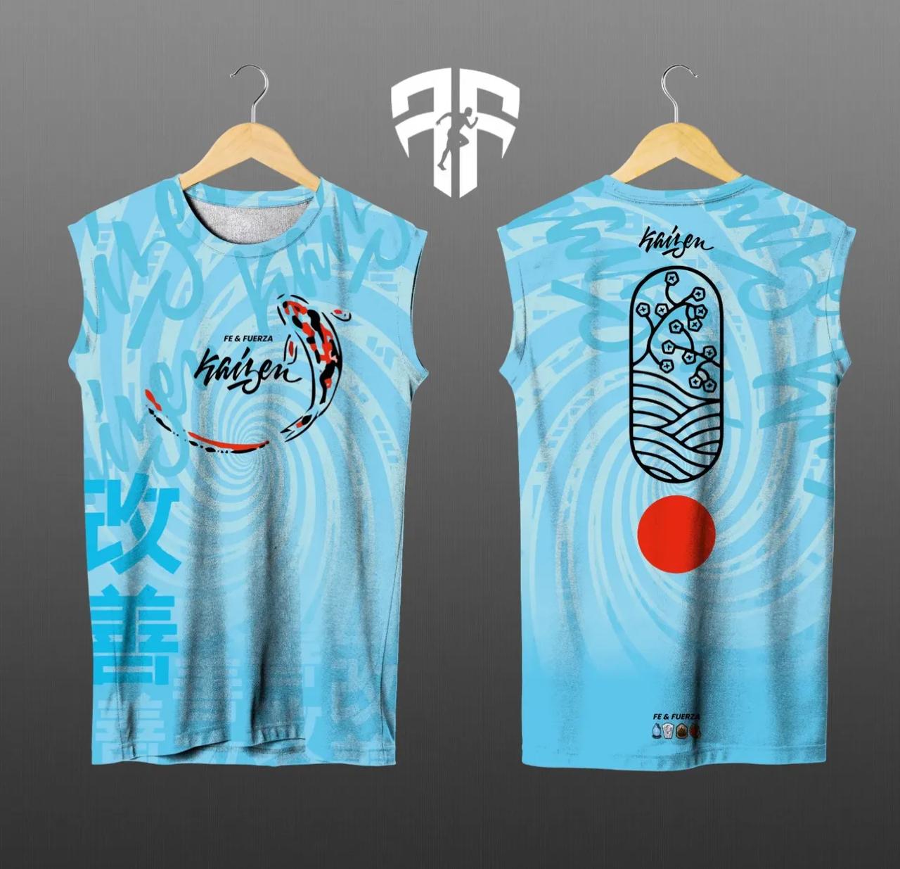 Playera sin mangas celeste inspirada en la cultura japonesa con el concepto Kaizen, presentando un elegante pez koi y el símbolo del sol naciente. Ideal para deportistas que buscan estilo y motivación.