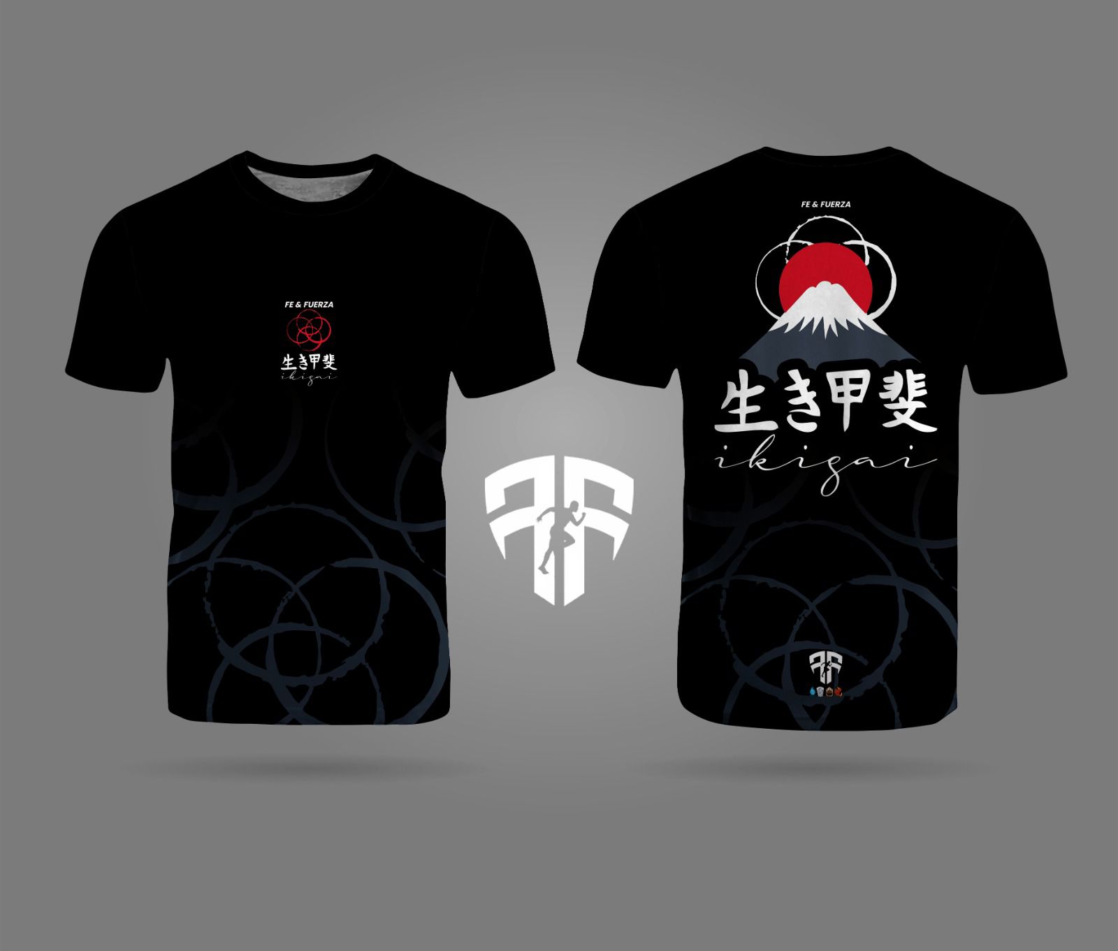 Camiseta negra deportiva con diseño inspirado en la cultura japonesa, featuring el Monte Fuji, el sol naciente y la palabra 'Ikigai'. Perfecta para entrenar o uso diario.
