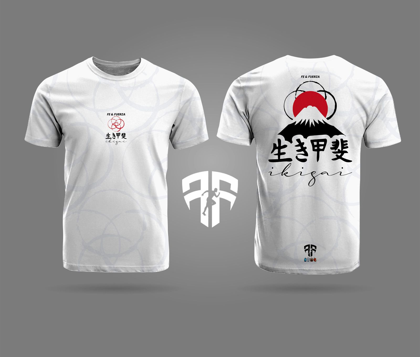 Camiseta blanca inspirada en el concepto japonés Ikigai y el Monte Fuji, con un diseño que promueve Fe y Fuerza. Perfecta para expresar tu razón de ser y espíritu inquebrantable en el día a día o durante tus actividades.