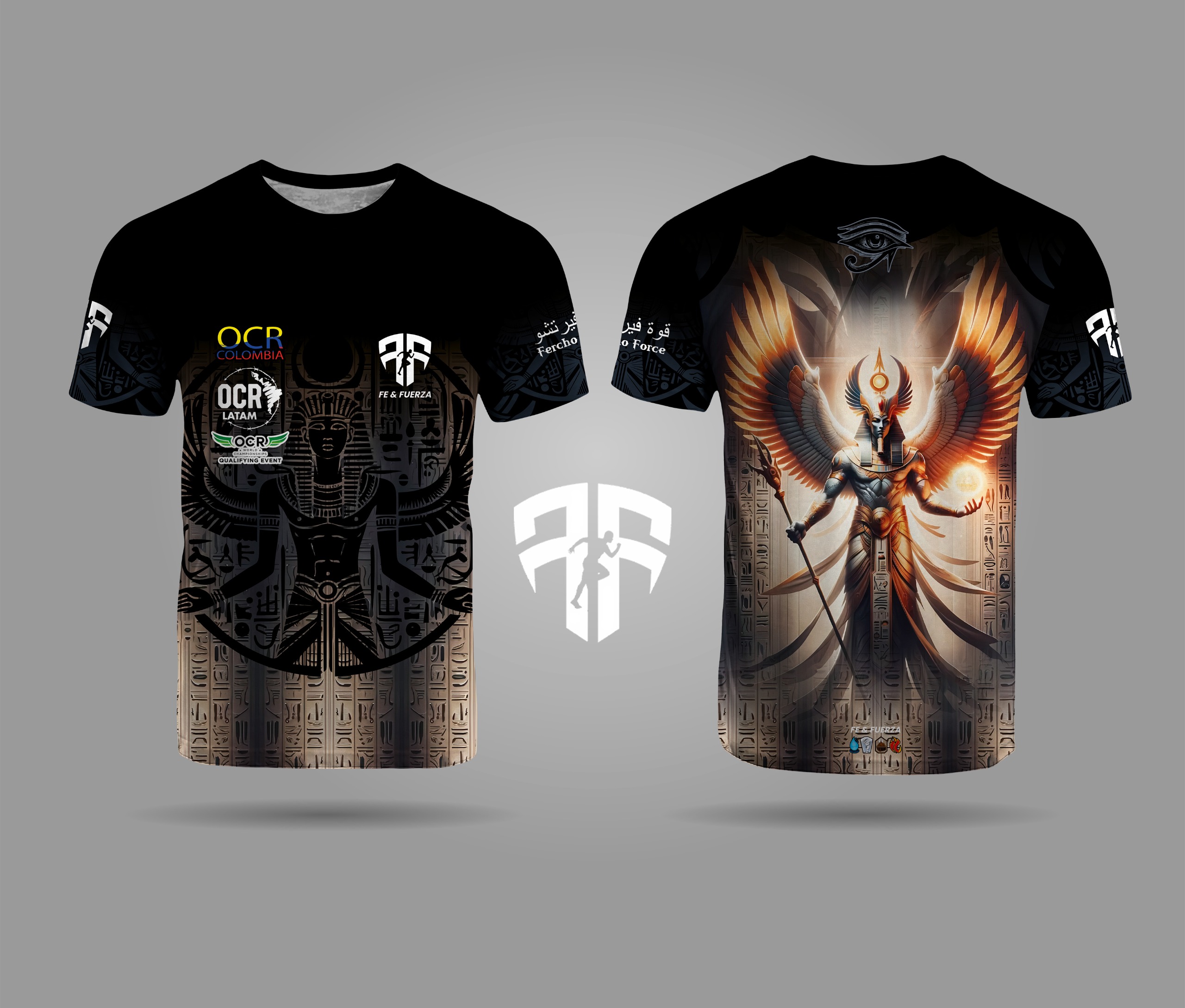 Camiseta de competición OCR Colombia con diseño exclusivo inspirado en el antiguo Egipto, destacando a Horus y jeroglíficos. Ideal para atletas de carreras de obstáculos.
